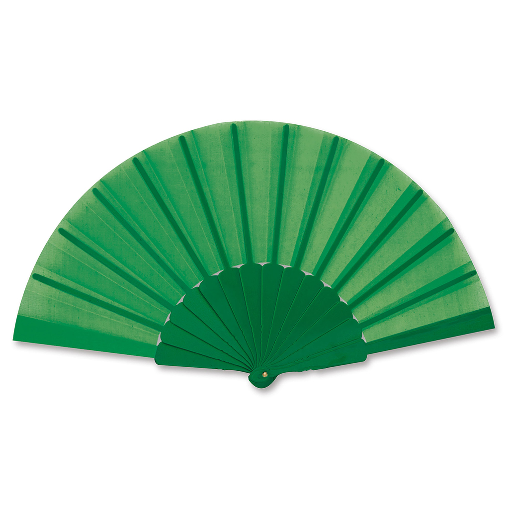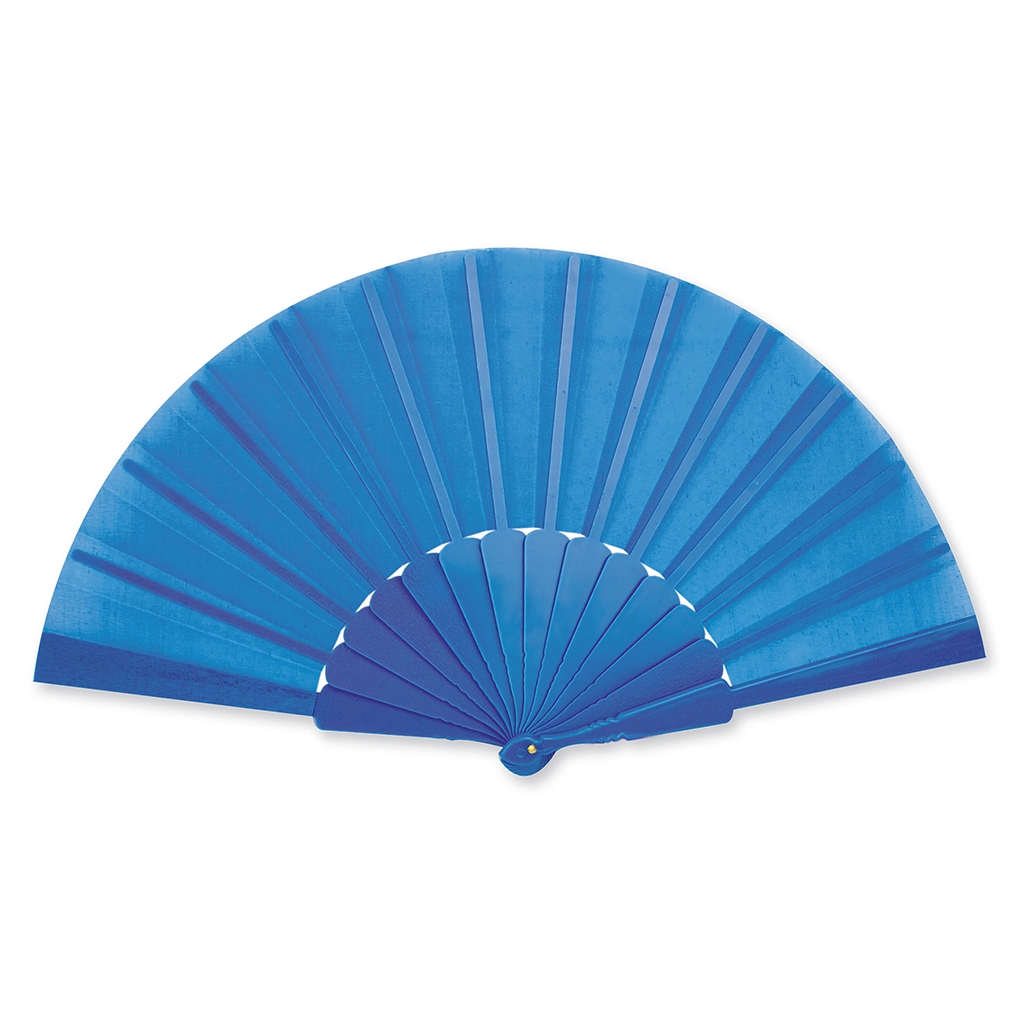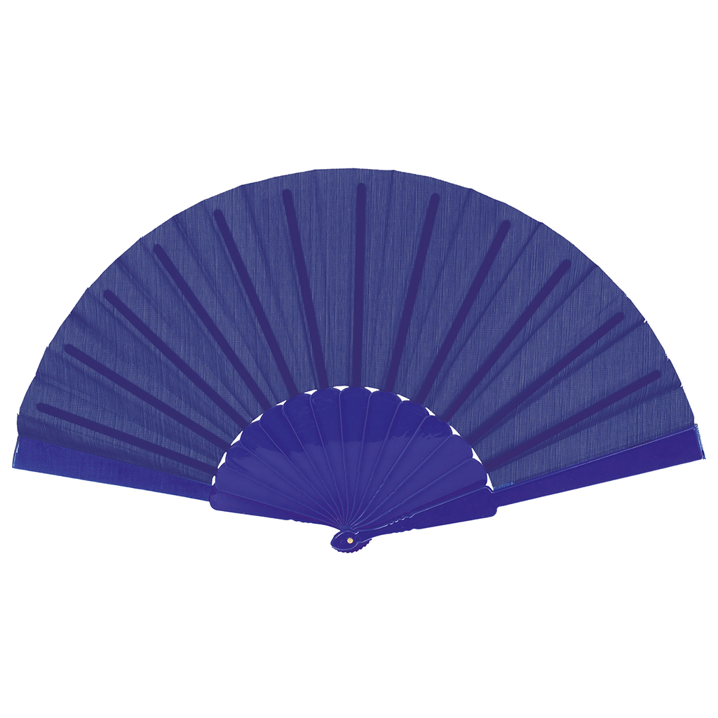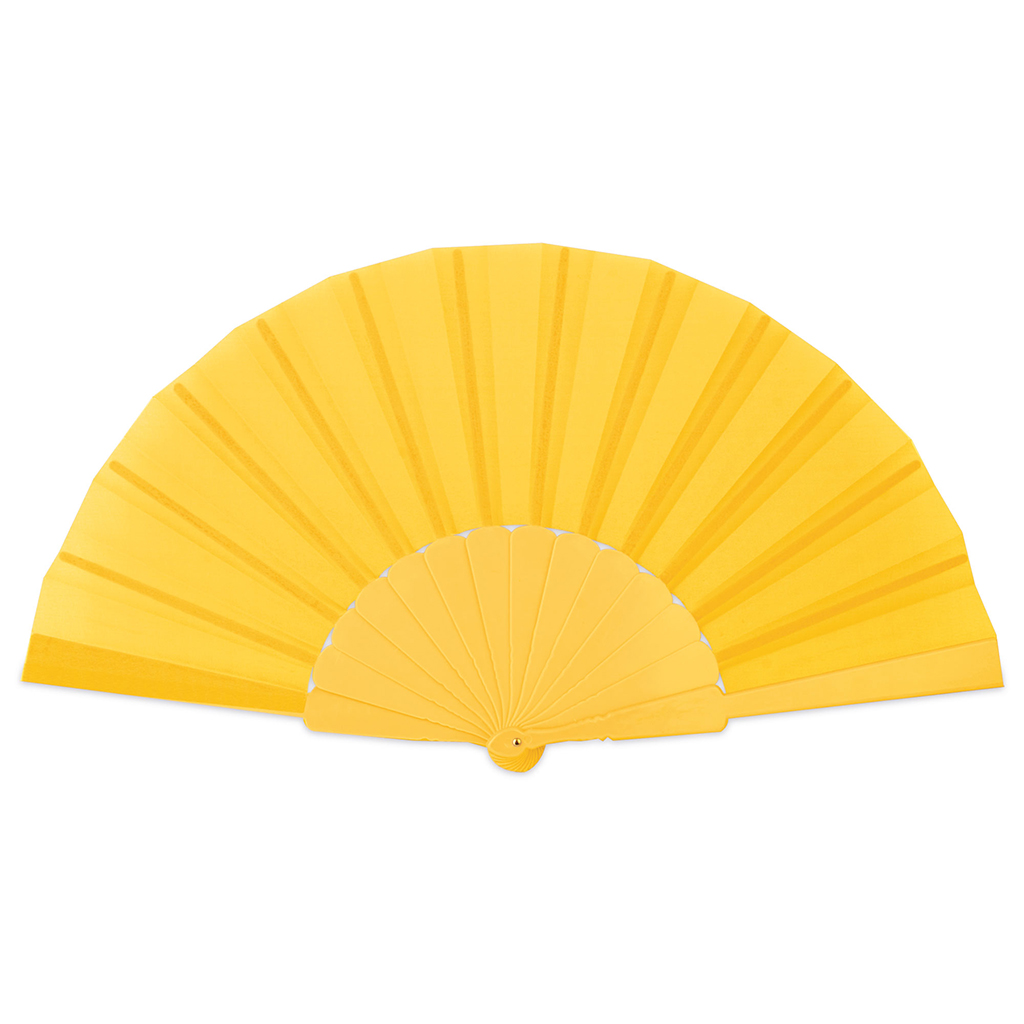 Abanico de 14 varillas de plástico y tela en poliéster de variados colores.
