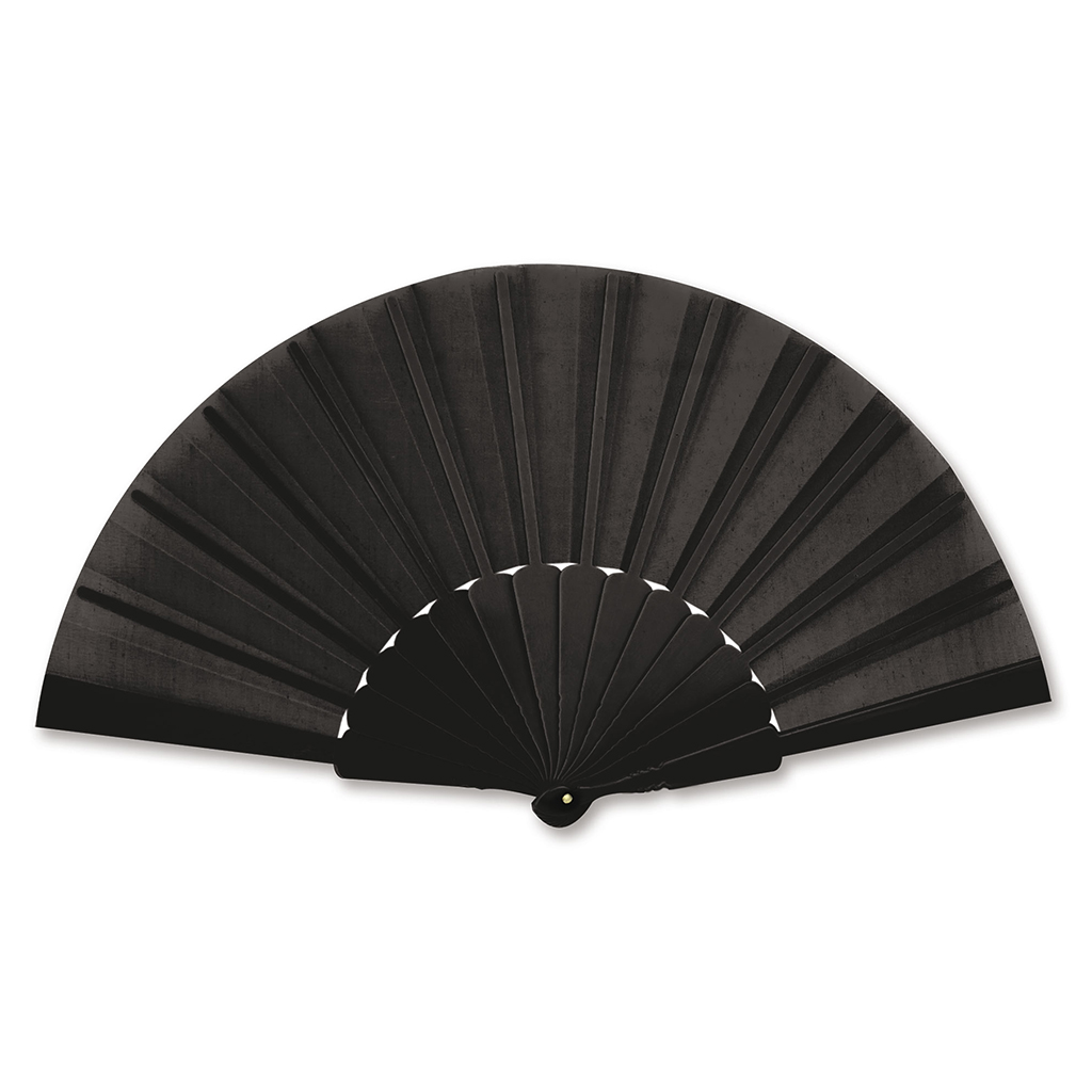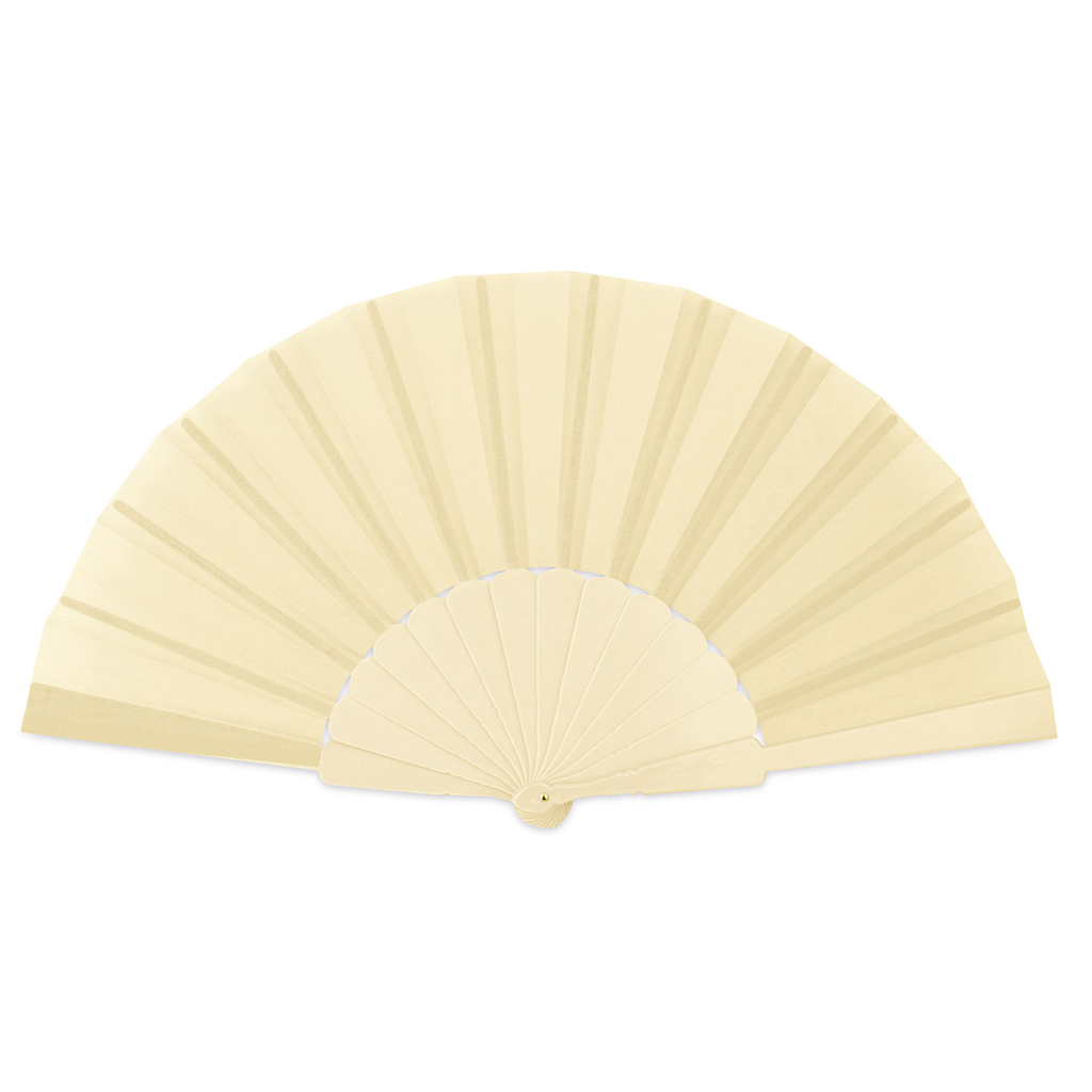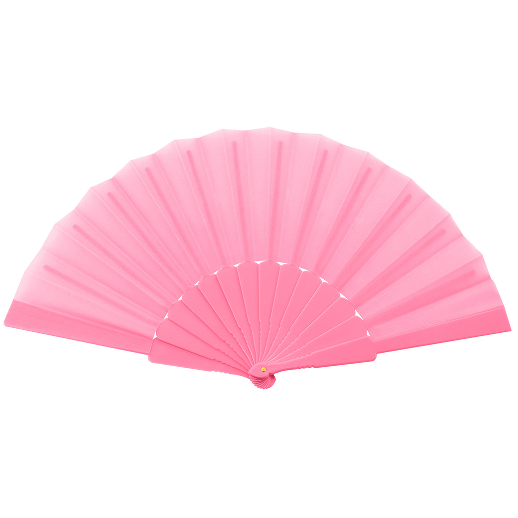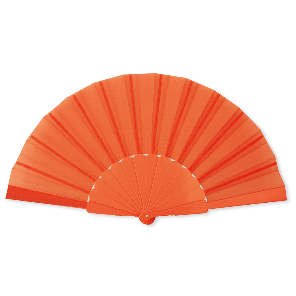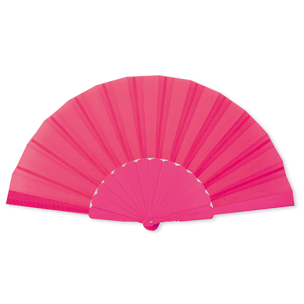 Abanico de 14 varillas de plástico y tela en poliéster de variados colores.